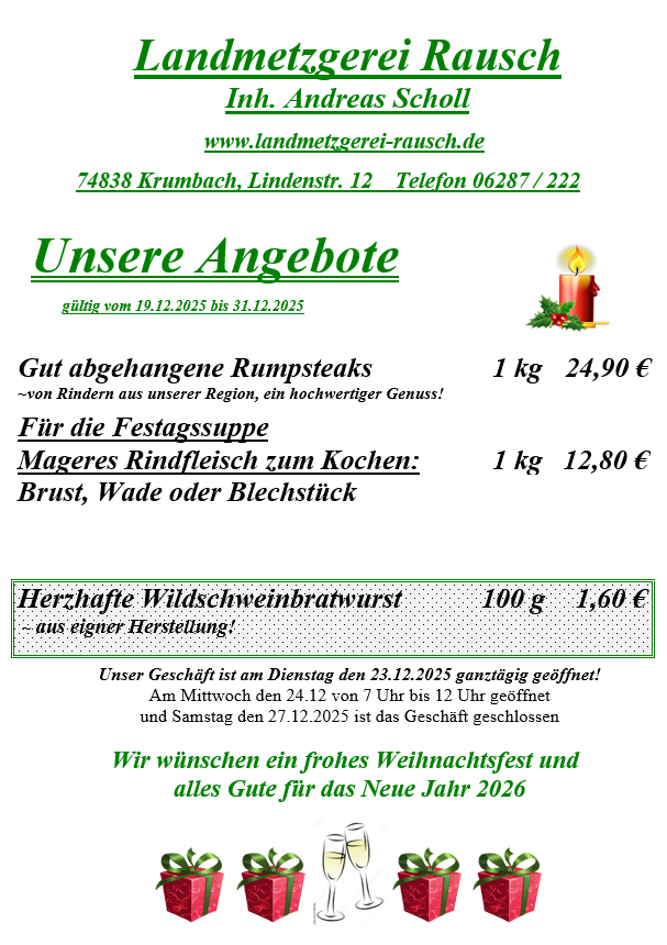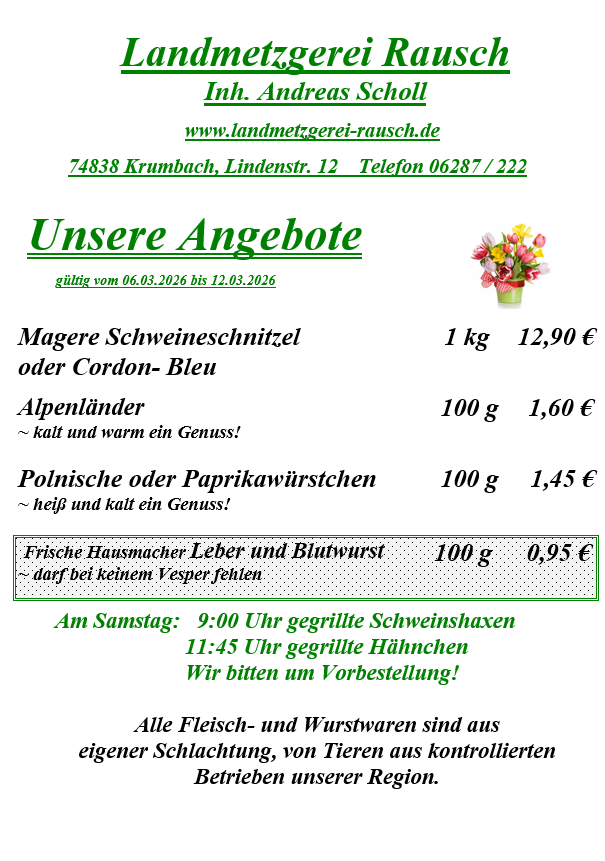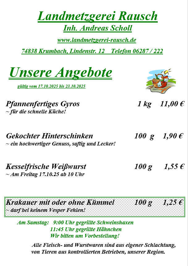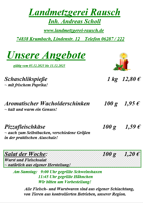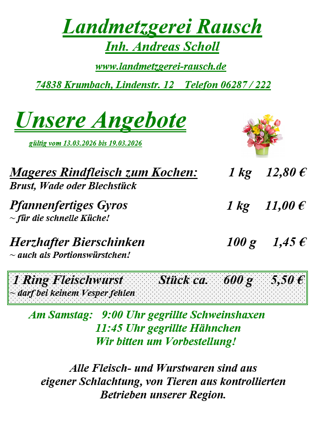 Lindenstraße 12 74838 Krumbach Tel. 06287 222 Fax 06287 929557 krumbach@landmetzgerei-rausch.de